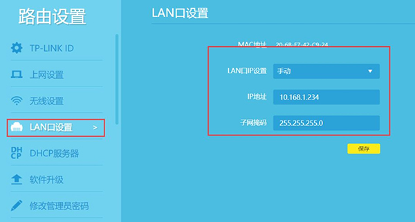 如果主路由器的设置网址是192.168.3.1,则二级路由器的LAN口IP修改为192.168.3.X(2<X<254)。
