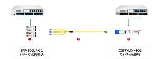 依次将4块10G SFP+光模块插入一台交换机的10-Gbps SFP+端口中,再将一块40G QSFP+光模块插入另一台交换机的40-Gbps QSFP+端口中,最后在中间以一根分支光纤跳线进行连接。