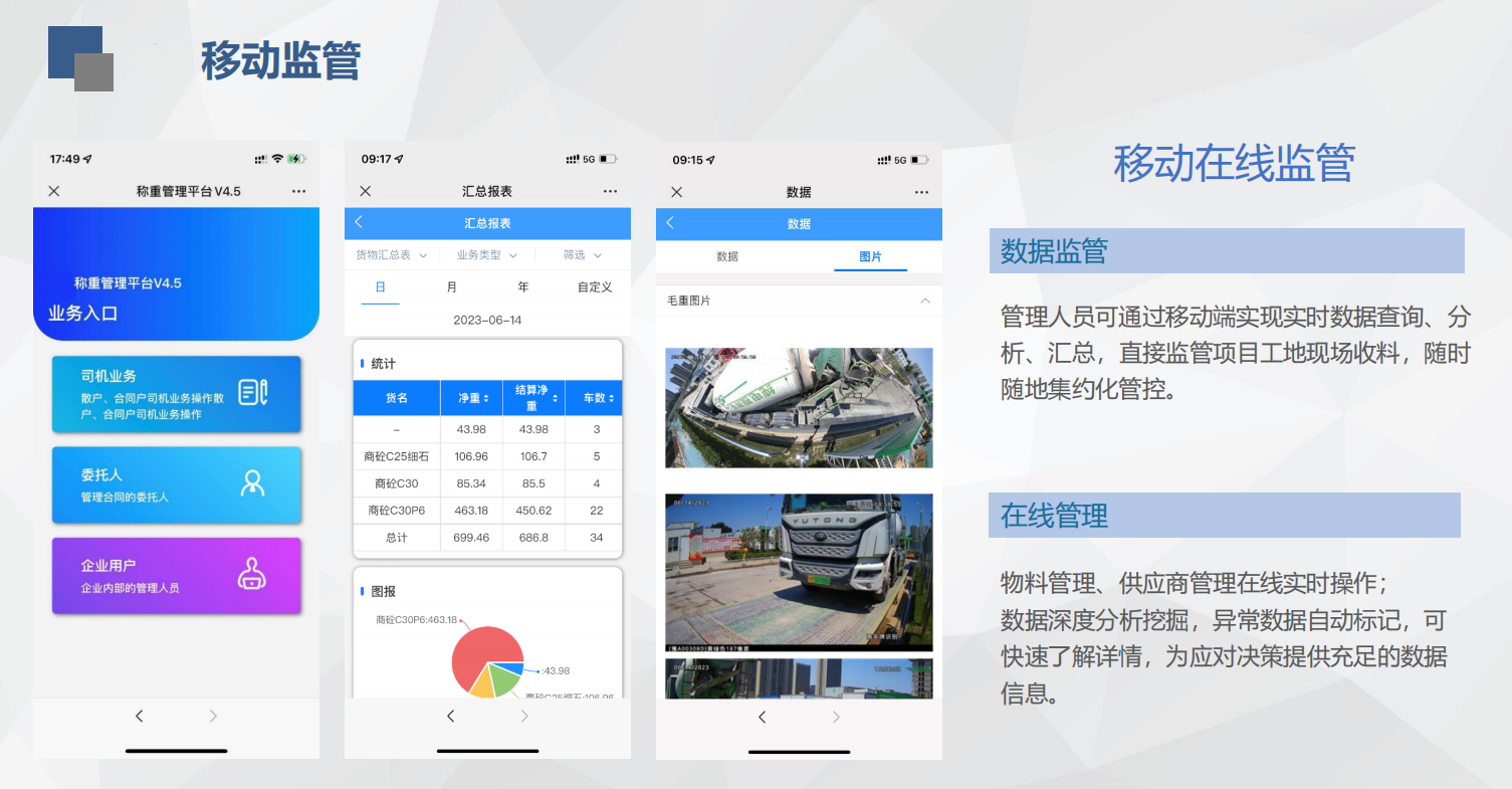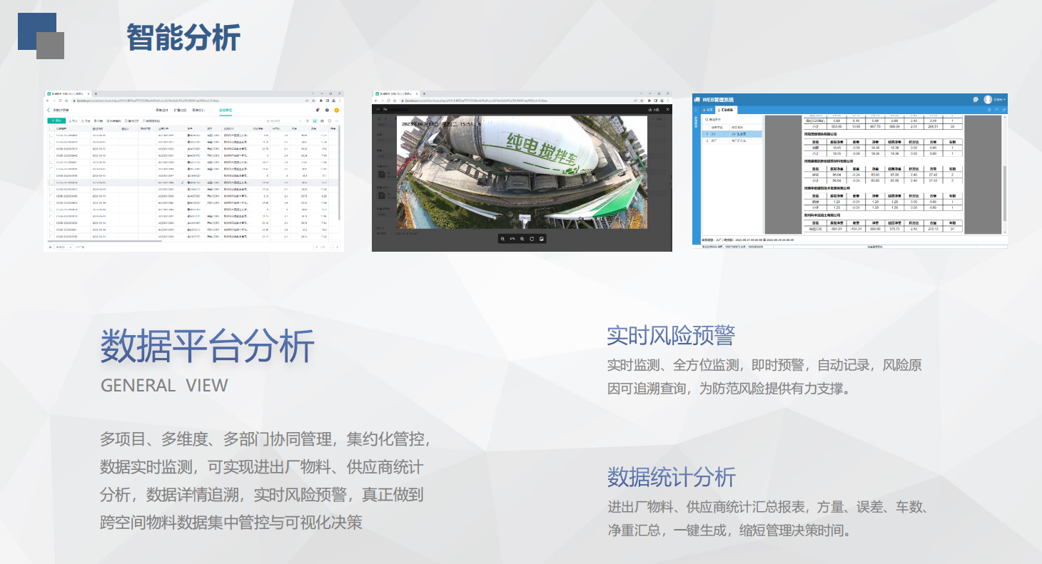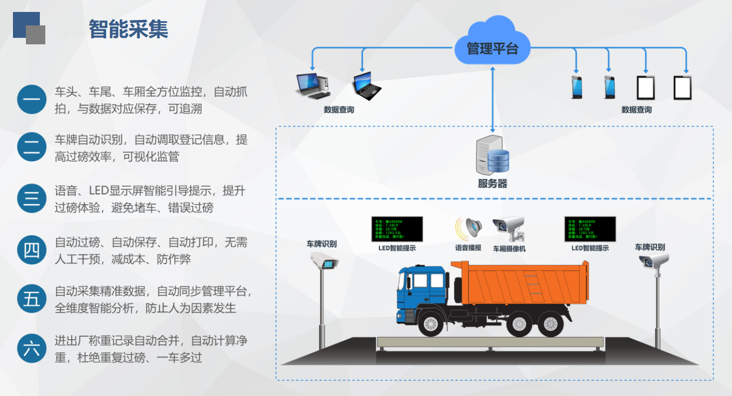本系统综合运用物联网、云计算、移动互联网、AI等技术,整合常规地磅及配套智能硬件,全自动采集、记录车辆过磅信息,极大优化并减少磅房内工作,实时拍摄过磅画面、自动打印过磅凭证,确保过磅数据真实、过程规范,提供简单轻便、自动智能的物料验收服务。