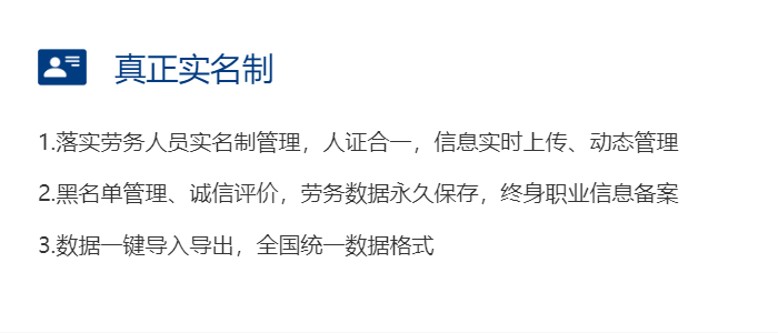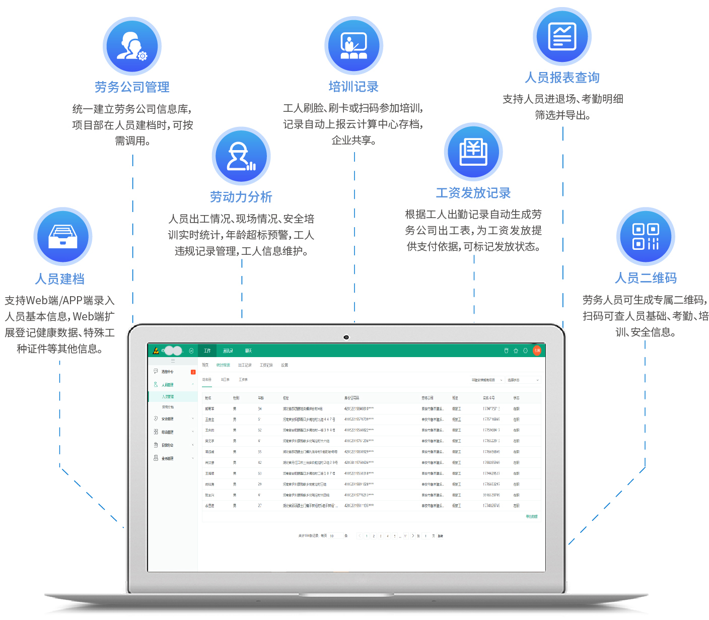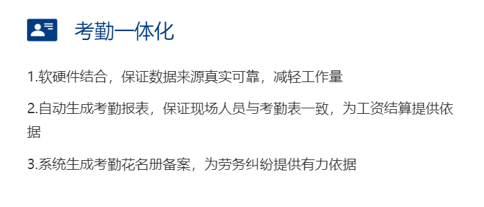 本系统基于AIoT开发,运用生物识别、移动互联网、云计算等技术,核验工地人员身份信息,打造集实名信息、合同、证书、考勤、工资、培训等于一体的人员信息化管理平台,有效避免劳务纠纷,规范人员行为,落实工地教育,保障施工,是科技型工程用工和劳动力分析工具。