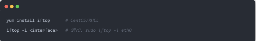 iftop 是一个基于文本的实时流量监控工具,可以显示网络接口的实时流量情况,包括上传和下载速度。安装并使用 iftop: