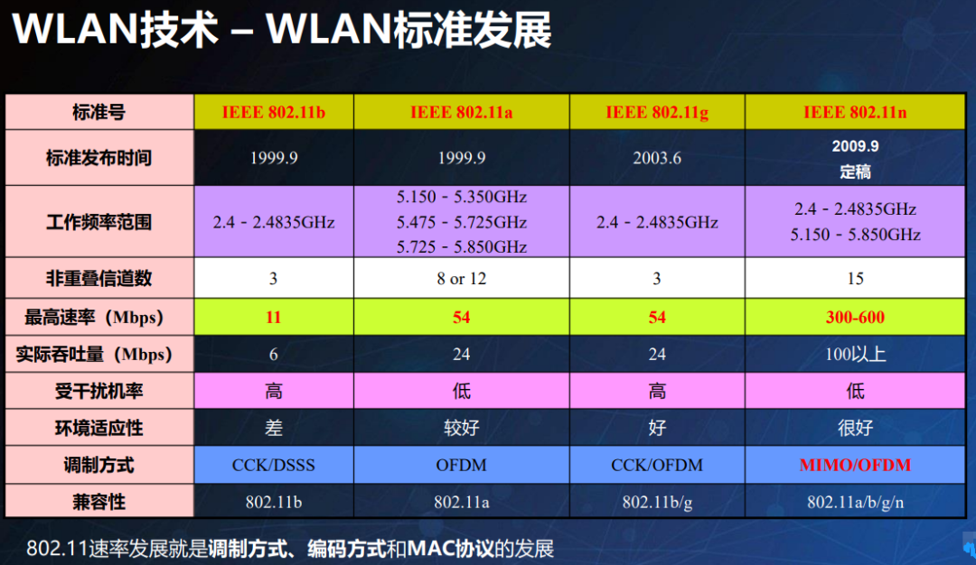 - IEEE 802.11g:2003年发布的802.11g标准,同样使用2.4GHz频段,但传输速率提升到了54Mbit/s。这一标准进一步推动了Wi-Fi的普及和应用。