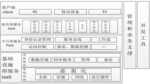 "智慧园区"功能构架的制定将决定规划的高度和边界。在顶层设计阶段,框架设计,包括园区基础设施层、园区平台、园区软件支撑平台、及客户端四个层次。