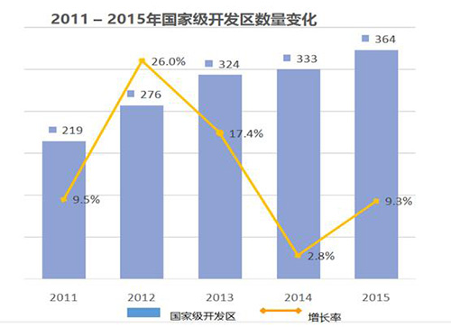 目前,中国有各类产业园区15000多个,对整个中国经济的贡献达到30%以上。国家级开发区数量从2011年的219家增长到2015年的364家,年均复合增长率达13.5%。国家级开发区数量在2012-2013年间快速增长后,进入到平稳增长阶段。2014年新获批国家级开发区共9家,增长率仅2.8%。2015年,新获批国家级开发区达到31家,增长率为9.3%。截至2015年底,国家级高新区共145家,国家级经开区共219家。