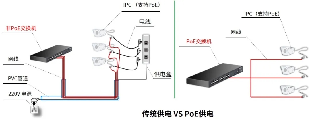 在很多场合,因为不方便部署电源或者部署电源成本过高及提高用电安全等,故会考虑采取PoE的方式,通过网线来对相关的设备进行供电。
