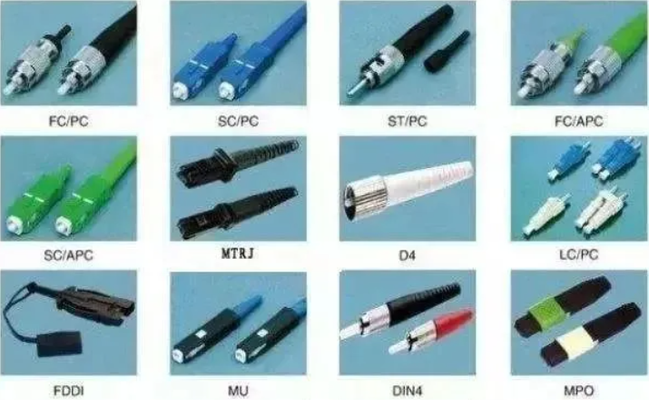 光纤连接器按传输媒介的不同可分为常见的硅基光纤的单模、多模连接器,还有其它如以塑胶等为传输媒介的光纤连接器;按连接头结构形式可分为:FC、 SC、ST、LC、D4、DIN、MU、MT等等各种形式。以下是一些目前比较常见的光纤连接器: