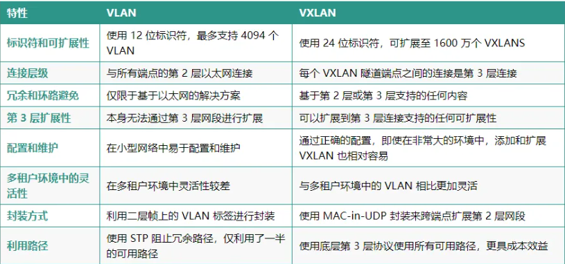 标识符和可扩展性 | 使用 12 位标识符,最多支持 4094 个 VLAN | 使用 24 位标识符,可扩展至 1600 万个 VXLANS |