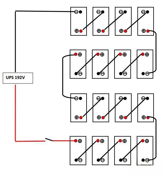 3. 若需要更高的192伏直流电源,仍然利用12伏蓄电池,通过特定的串联和可能的并联组合,可以达到所需的电压。详细的接线图如下所示。