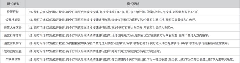 根据雷达红绿灯闪烁次数进入不同设置模式,一般杆长、杆类型、左右固定必须根据实际情况准确配置;人车区分、行车方向可保持默认配置;背景学习可以根据实际使用情况选择性配置;灵敏度只针对广告闸,且一般不需要进行配置。