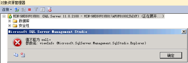 1. 在使用SQL Server Management Studio连接数据库时报错:值不能为null。 参数名: viewInfo (Microsoft.SqlServer.Management.SqlStudio.Explorer)