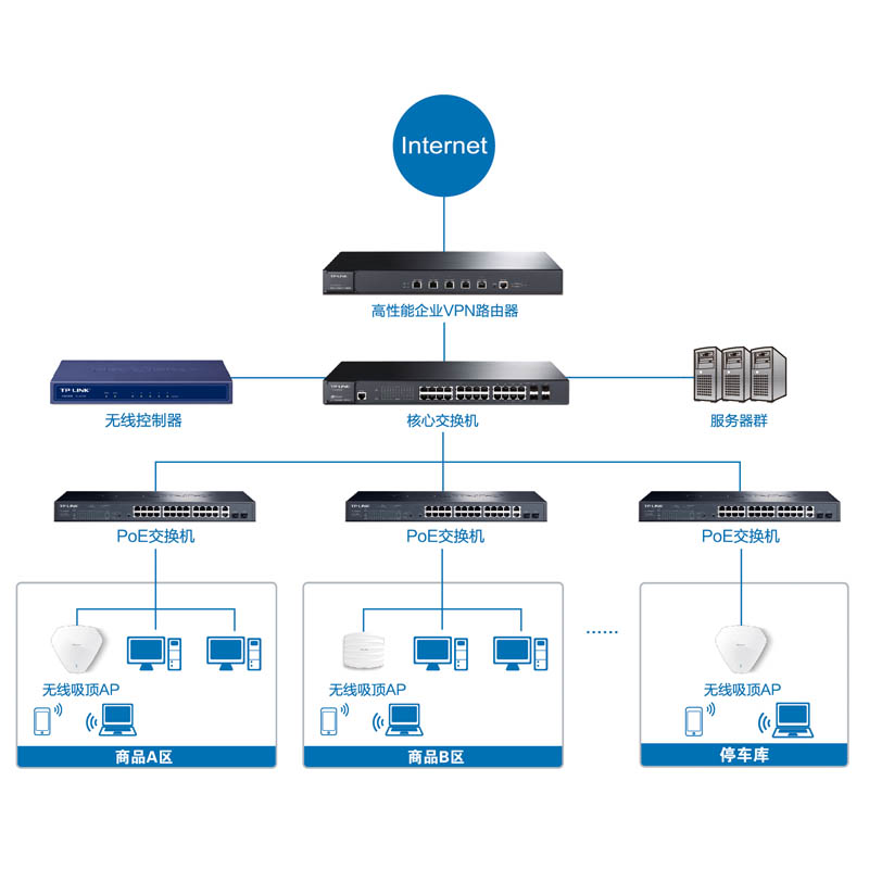采用企业级 AC-AP无线解决方案,实现商场/超市无线覆盖。