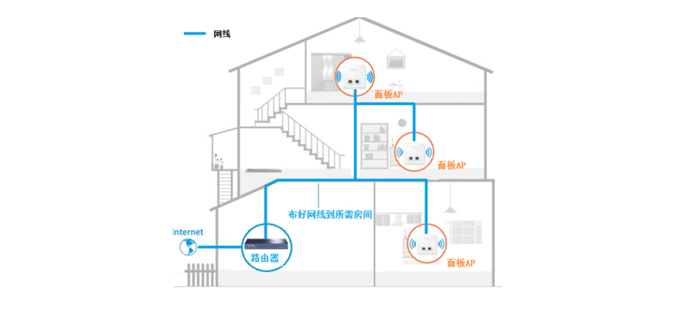 使用面板无线AP方案,是由一个主路由和多个面板AP组合而成,主路由器与面板AP之间通过家里预埋的网线传输信号, 面板AP可直接替换家里原有网络面板,无需重新布线,不破坏原有装修。如果您的家中已经预埋网线或者正在装修,是家庭无线覆盖方案是最佳选择。