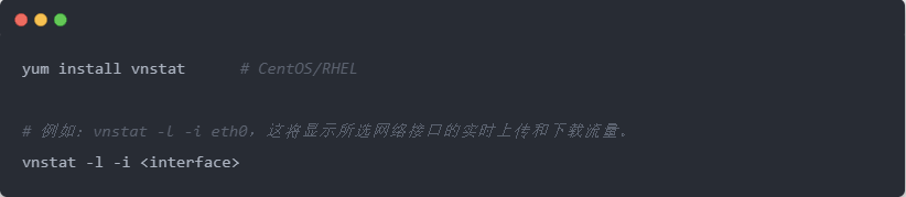 vnstat 是一个基于命令行的网络流量监控工具,它可以提供有关网络接口流量的详细统计信息,包括总体流量和每天/每月的流量使用情况。安装并使用 vnstat: