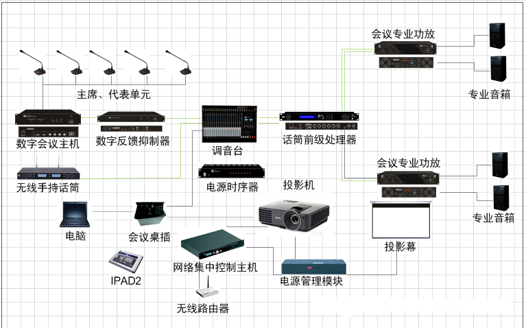 扩音子系统:负责会议声音的扩大和播放,包括扬声器、功放等设备。