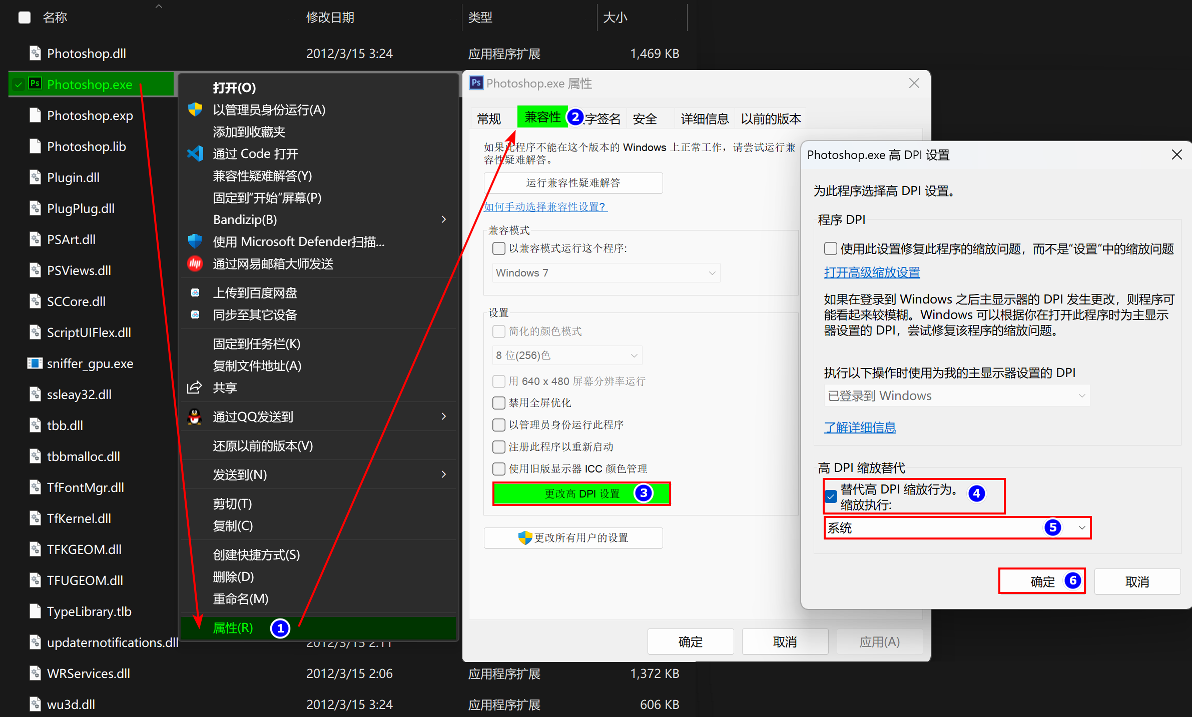 2、弹出窗口“兼容性”——“更改高DPI设置”;