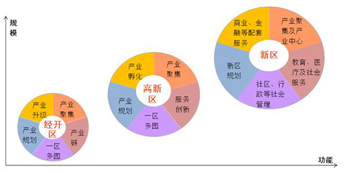 从时间维度来看,我国园区正在从传统的工业园区向新区过度,在形式上有从低级向高级,由单一向综合园区发展的趋势。尤其是经开区和高新区通过产业结构升级和服务内容升级,打造多产业聚集和社会服务职能,并逐步向新区方向发展。