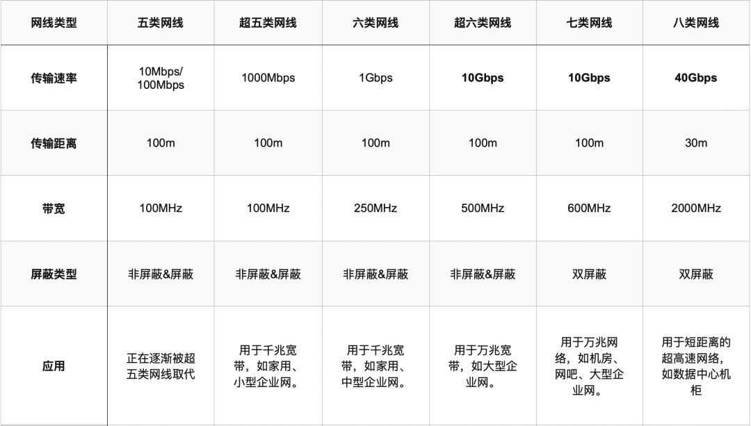 其实网线的分类还是比较多的,有五类(Cat5)、超五类(Cat5e)、六类(Cat6)、超六类(Cat6a)、七类(Cat7)和八类(Cat8) ,虽然从外观上来看,这些网线都差不多,但本质上还是有很大差距的。