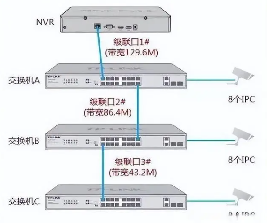 多个交换机串联:下图中,三个交换机A、B、C使用网线一一连接,每个交换机上各接入8个IPC,NVR接在交换机A上同时管理所有IPC。