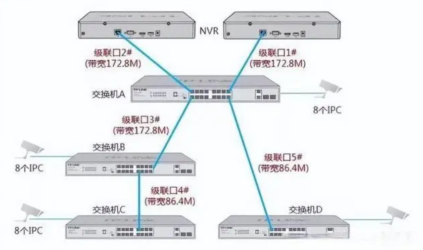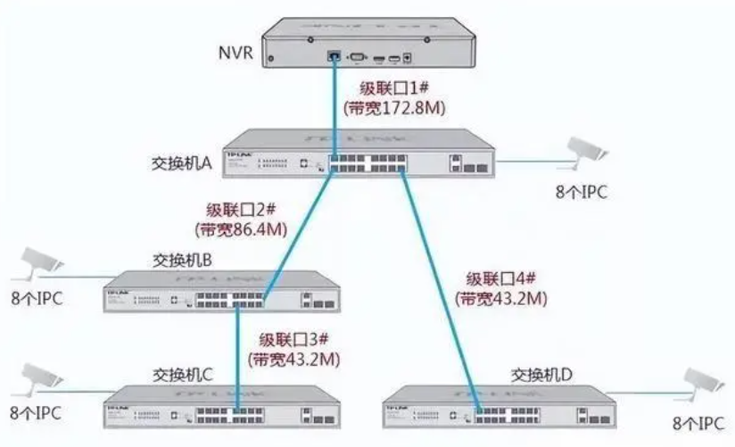 级联口4#和级联口5#带宽均为86.4M,级联口3#带宽为172.8M(被两个NVR同时取流所以带宽翻倍),都超出了70M,所以交换机B、C和D推荐使用千兆上联(千百兆混合)交换机;