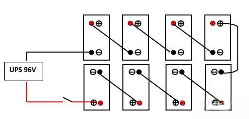 2. 对于需要96伏直流电源的应用,同样使用12伏蓄电池,但通过不同的串联组合,可以实现96伏的输出。具体接线方式请见下图。