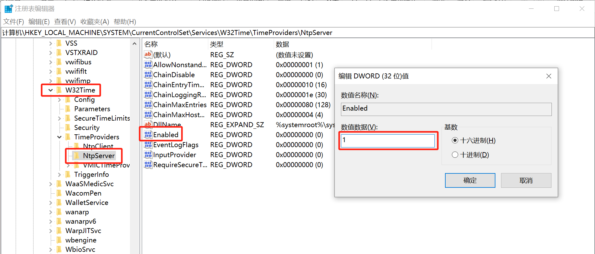 \HKEY_LOCAL_MACHINE\SYSTEM\CurrentControlSet\Services\W32Time\TimeProviders\NtpServer,把Enabled设置为1,为打开NTP服务,操作如下图所示。