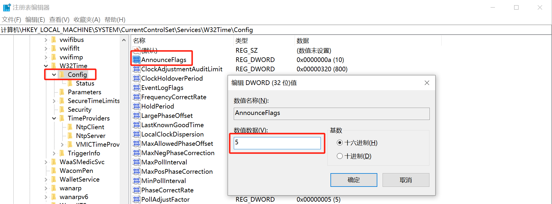 计算机\HKEY_LOCAL_MACHINE\SYSTEM\CurrentControlSet\Services\W32Time\Config,并把AnnounceFlags的值设置为5(系统默认为a)。