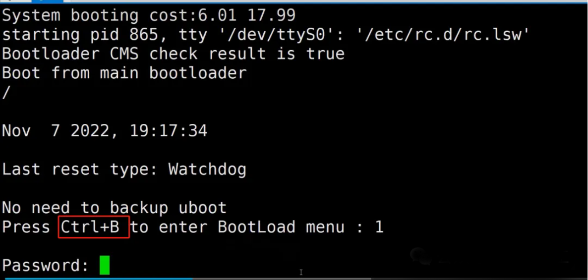 三、重启交换机,当出现“Press CTRL+B to enter BIOS menu”时,按下“Ctrl+B”