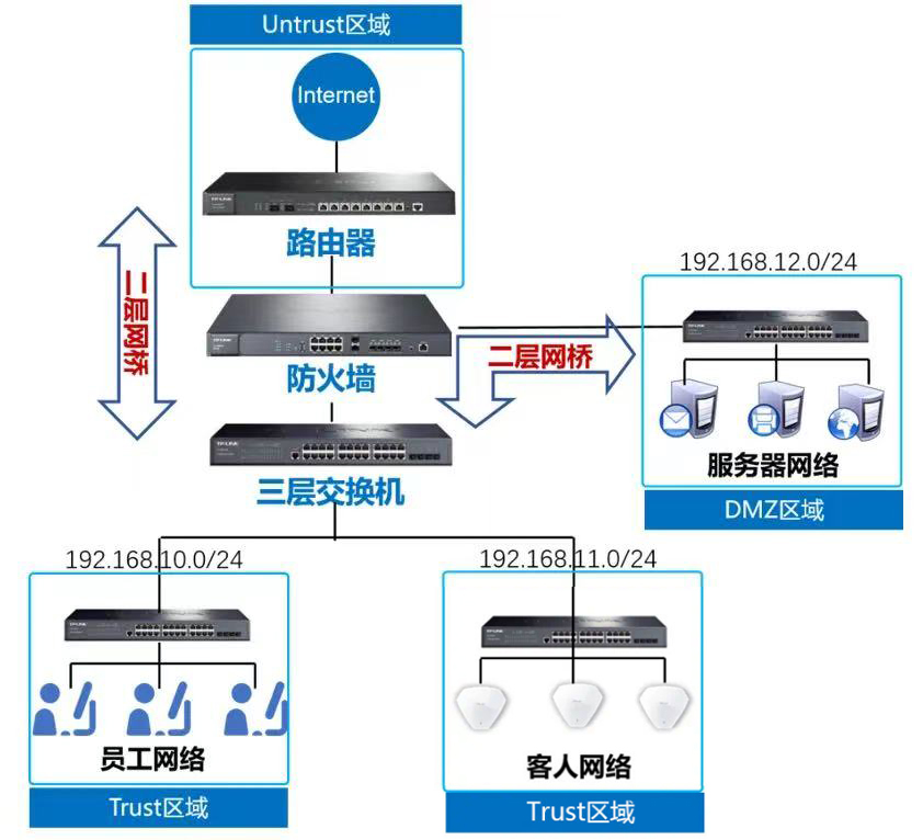 在不影响原有网络结构的基础上,可以使用防火墙的网桥功能。将部分或所有接口设置成网桥,使这些接口工作在二层网络中,同样,只要数据经过网桥接口,网络就能被防火墙防护。
