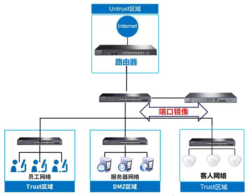 旁挂在核心交换机上,将通过交换机的流量映射到防火墙,利用防火墙对所有流量进行审计。一般用于只需要进行审计的场景,这种模式无法对上网行为进行管理和控制。