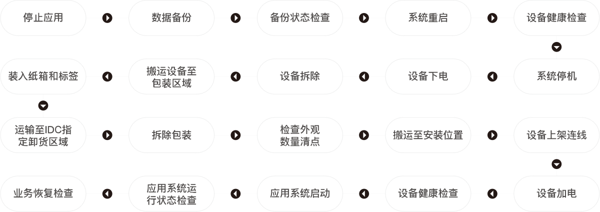 昊之云根据客户需求协助用户进行数据中心迁移(Datacenter Relocation),提供机房物理搬迁和系统搬迁服务。依托主机、存储、网络、安全设备、数据库、中间件、灾备等各领域专家资源,与客户高效协同,共同制定迁移策略和计划,组织专业人员高效、可靠地执行迁移计划,确保客户数据中心设施完整、系统健全和数据安全。