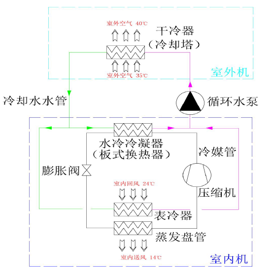 机房空调间接自然冷却系统由室内机组,室外干冷器(或冷却塔)和水泵等组成。室内机组是在水冷型机组的蒸发盘管上面增加了一套自然冷却冷水盘管。
