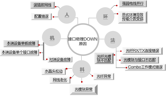 如何查看接口状态,以及当接口的物理状态处于DOWN状态时,如何定位接口故障的原因,并恢复接口到UP状态。引起接口物理DOWN的原因主要包括硬件故障和软件故障两个方面。硬件故障,包括本端或对端设备的硬件故障,例如单板、接口、光模块、光纤、网线等故障。软件故障,主要是链路两端配置不一致,例如端口协商模式、速率、双工等配置不一致。为了更加精确的分析接口物理DOWN的故障原因,本文以故障可能的引入点为线索,按照人为因素导致的故障、设备自身硬件故障、连接介质故障、连接介质使用方法错误、环境因素导致的故障五步骤为排查顺...